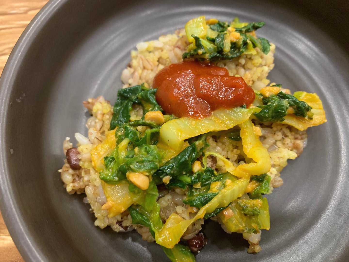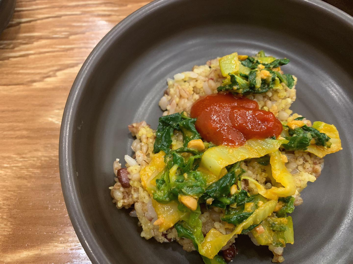 잡곡밥은 팥 밥 위에 나물에 올라가 있는 밥으로