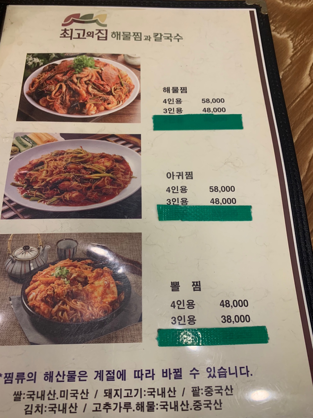 이곳의 대표 메뉴는 해물찜과 칼국수입니다.