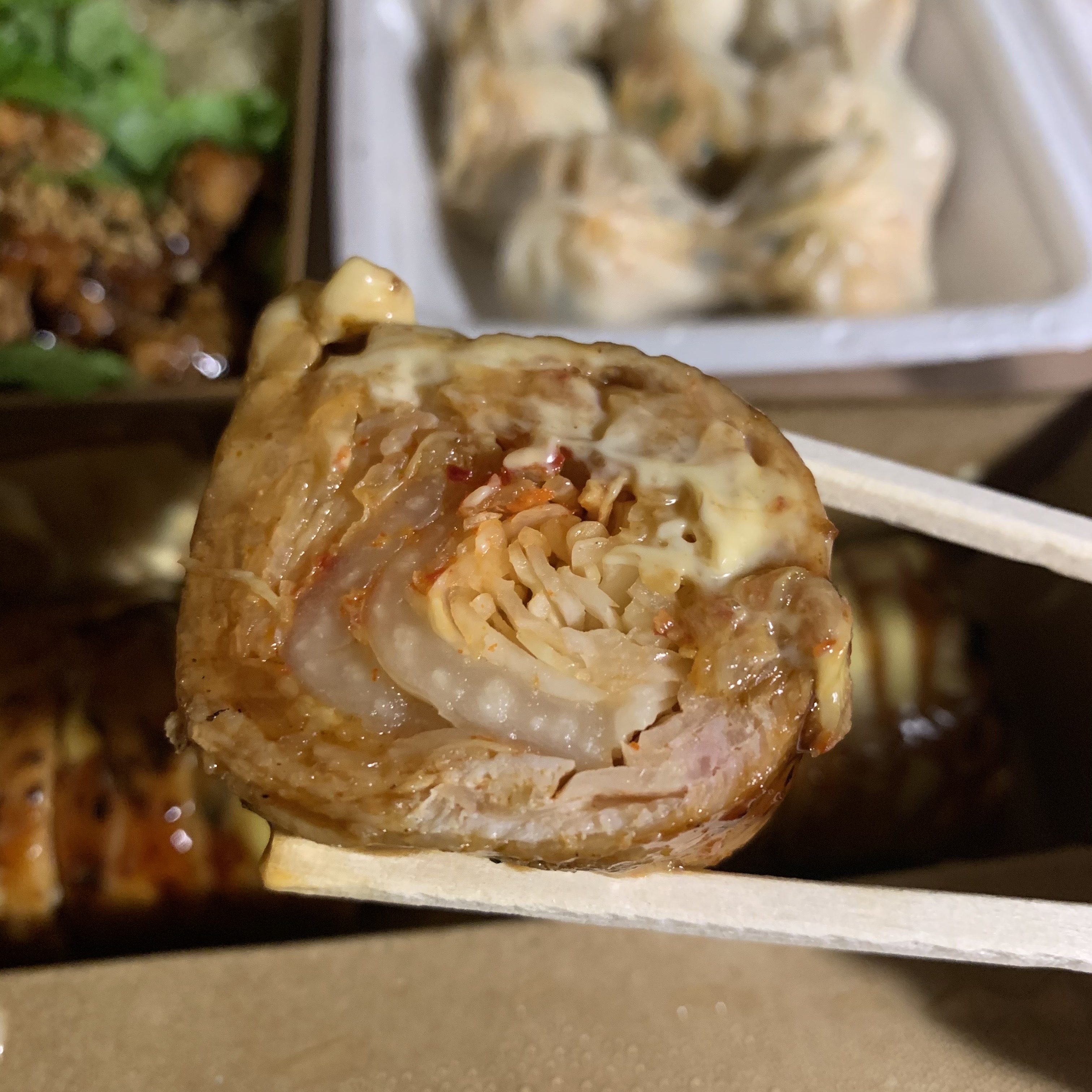 김치를 흑돼지로 돌돌 말아놓은 형태로